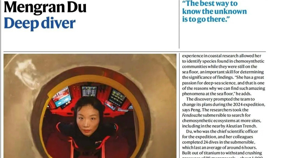 2024年夏,杜梦然作为首席科学家,带领团队搭乘“奋斗者”号在西北太平洋千岛-堪察加海沟9533米深处,发现了全球已知最深的化能合成动物生态系统。